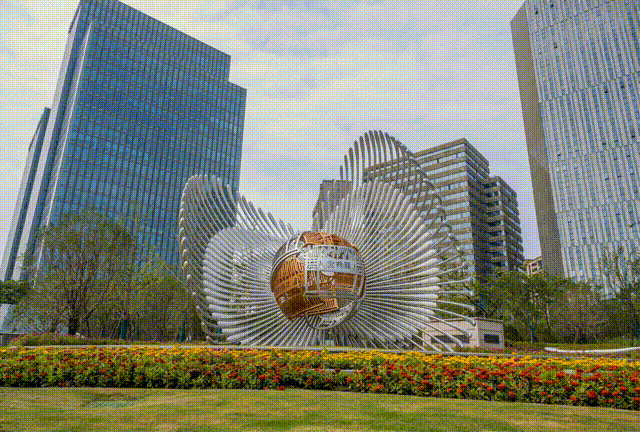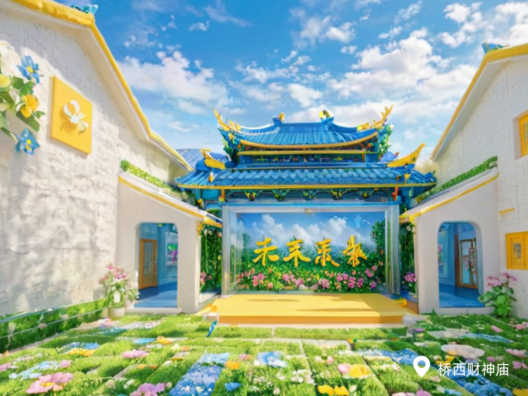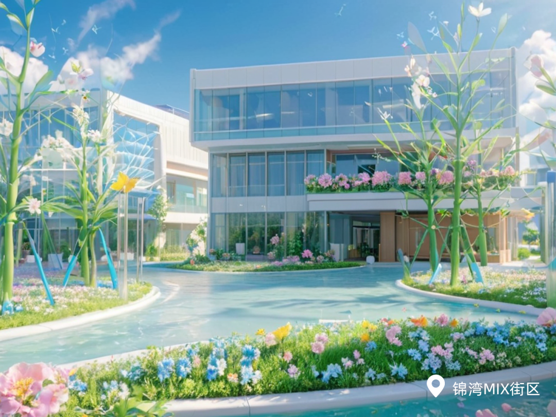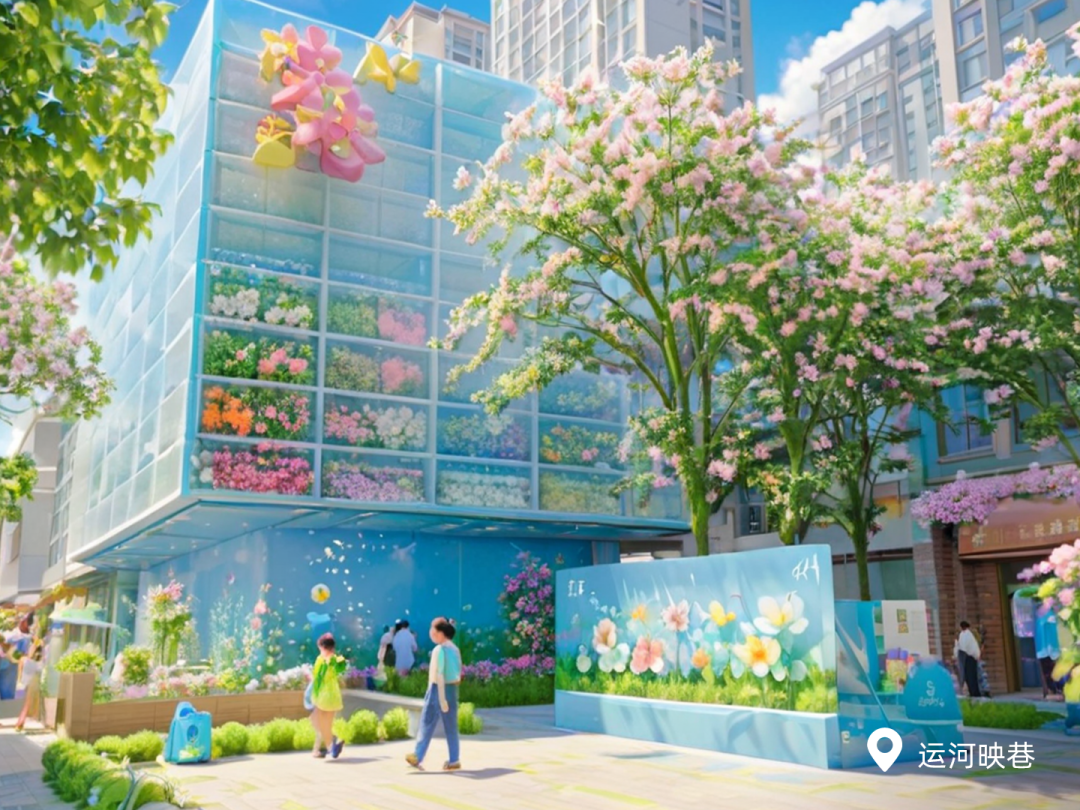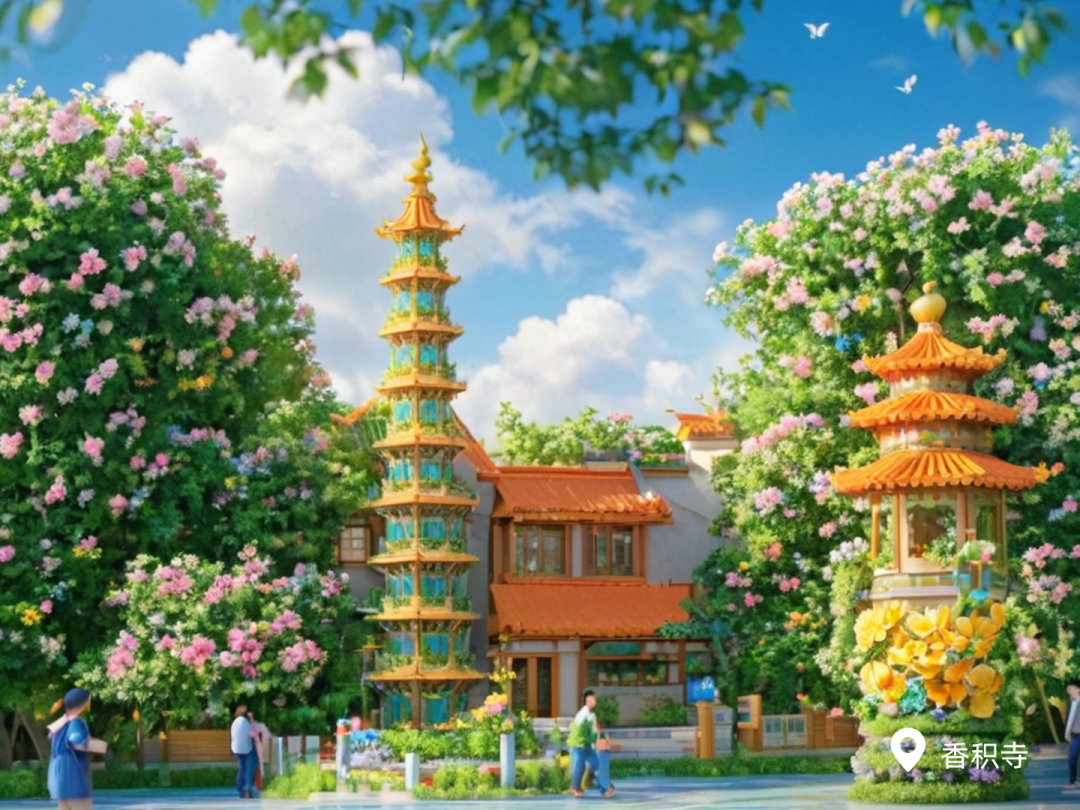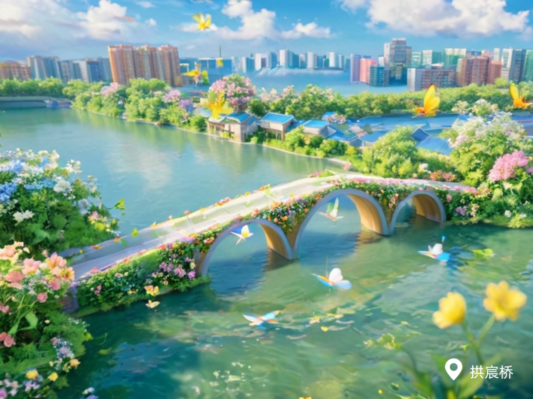 两岸繁花娇似锦,蝶舞翩跹画图中。