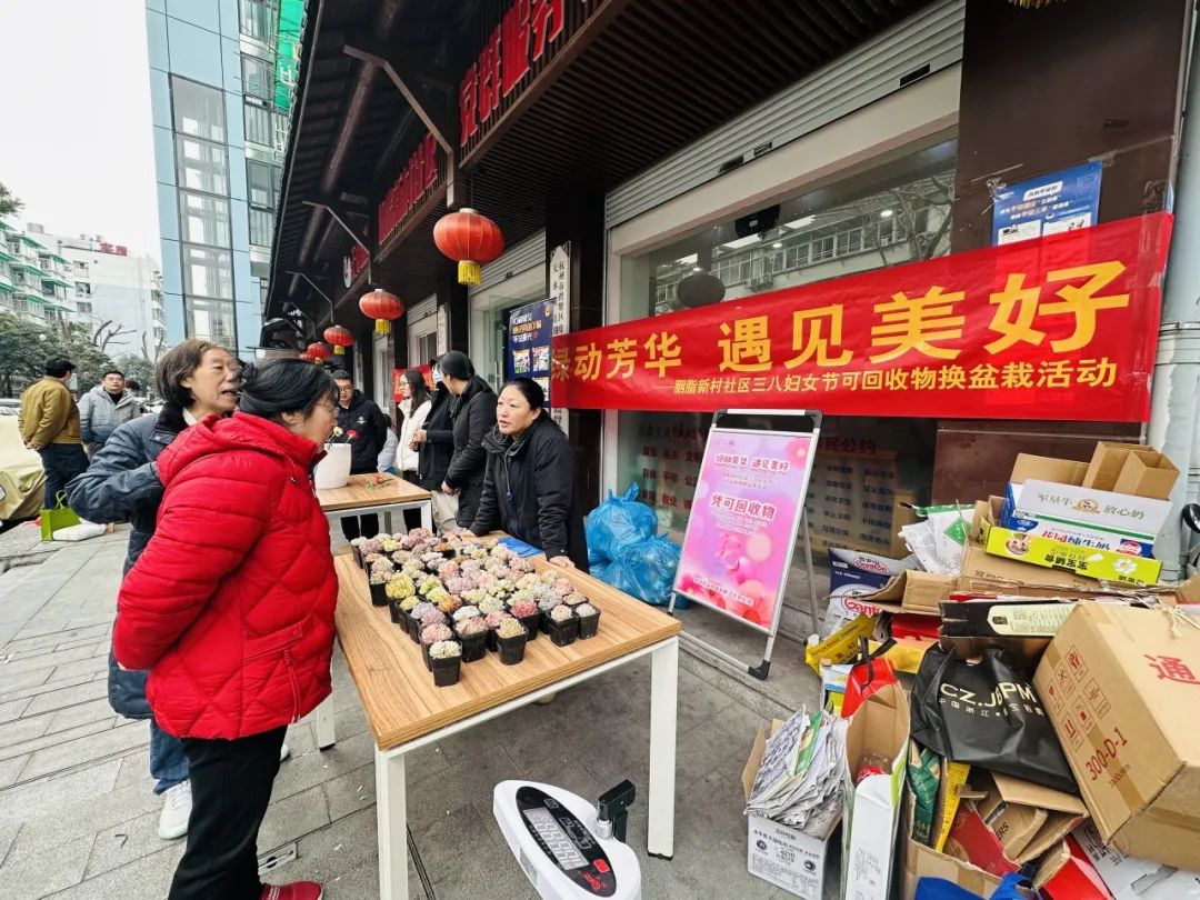 胭脂新村社区以“绿动芳华,遇见美好”为主题,开启可回收物换盆栽活动,居民们可将家中堆积的可回收物带到社区换取多肉盆栽,同时,全体女性居民也可到此领取康乃馨一支,以赠送绿植的形式为大家种下一颗 “绿色、低碳、环保” 的种子。