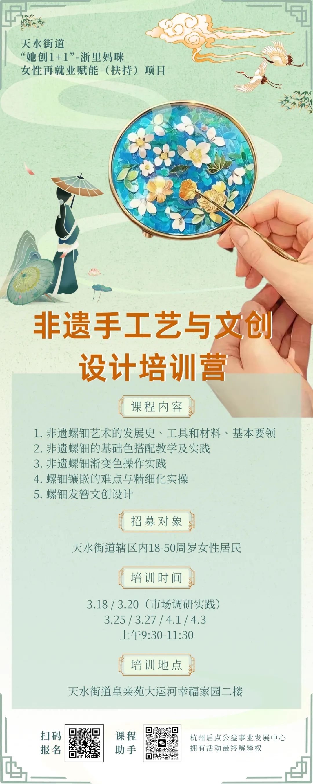 天水街道 “她创 1+1”- 浙里妈咪女性再就业赋能项目重磅推出 “非遗手工艺与文创设计培训营”,带你沉浸式体验螺钿艺术的精妙,开启文创设计新旅程!