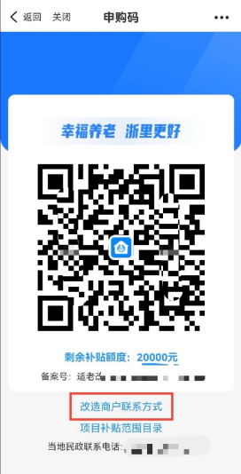 第一步:通过浙里办-浙里康养-申购码进入系统。点击“改造商户联系方式”;