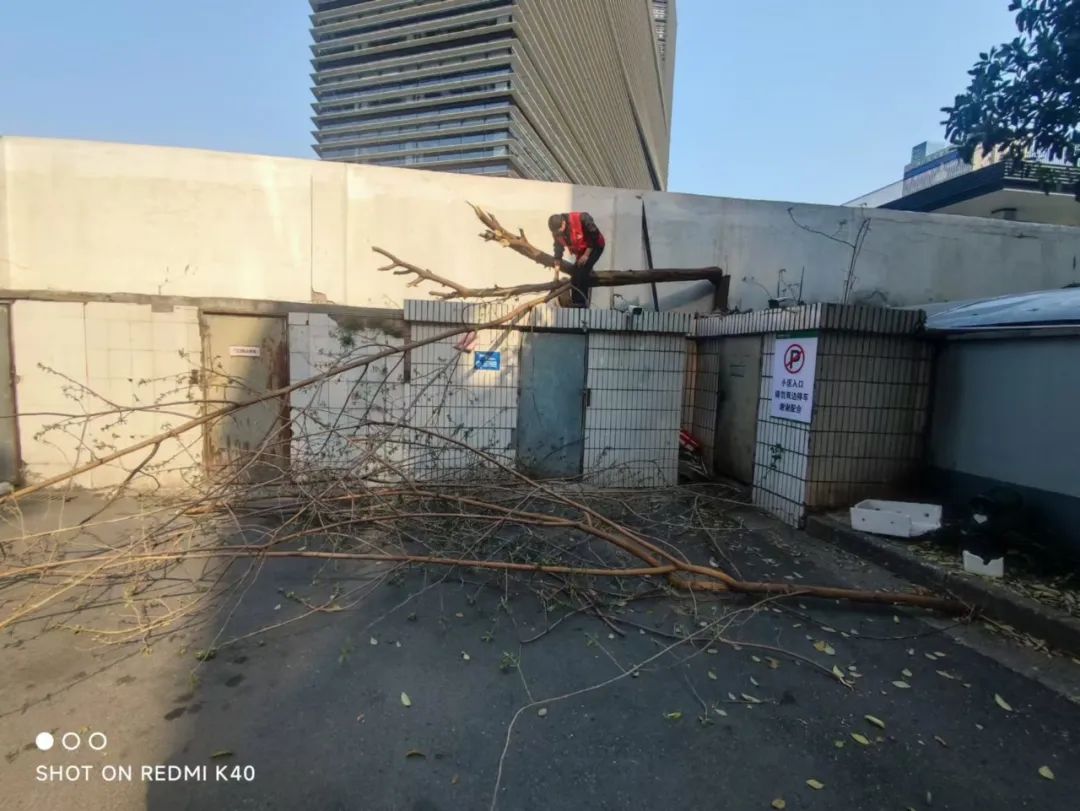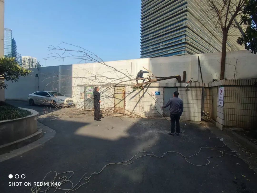 面对横跨多单位辖区的处置难题,胭脂新村社区迅速启动“网格理事会”机制,由社区书记牵头,联动楼道理事、物业理事、工程理事、先锋理事及相关人员参与协商,经多方论证,最终确定“分段截除+根系清理”的科学方案。