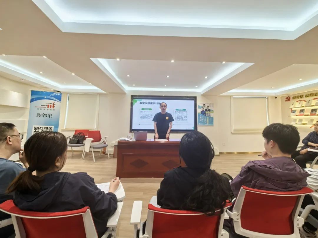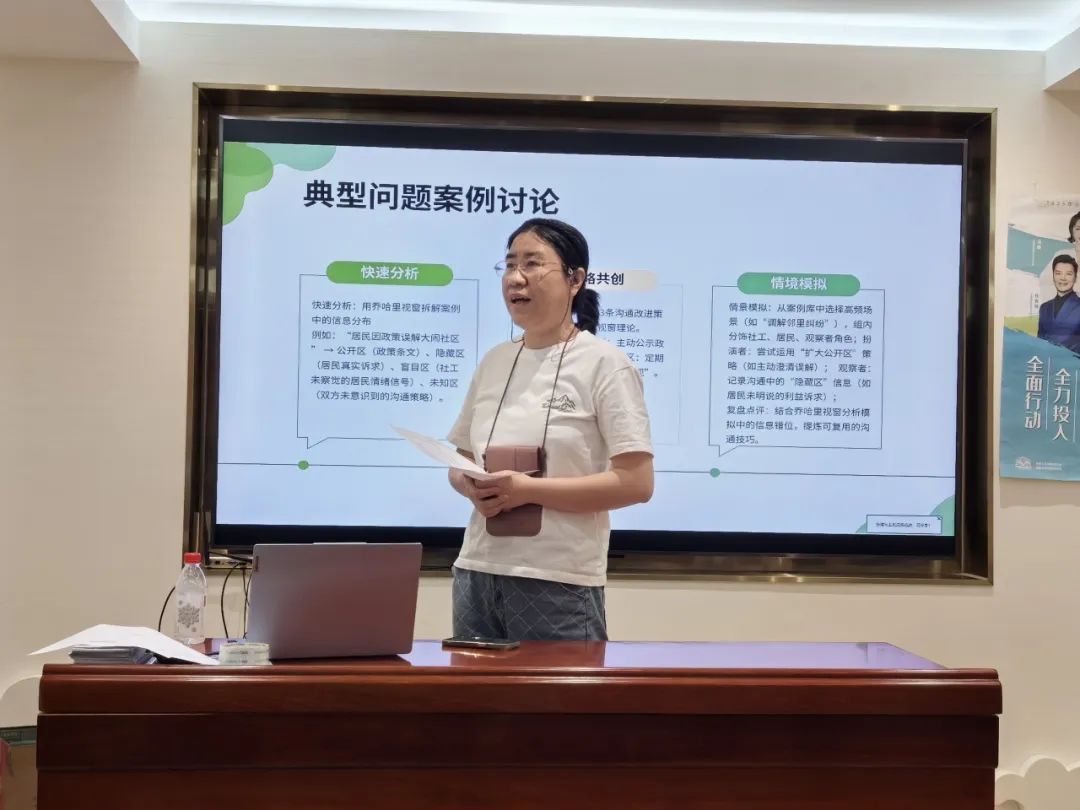 在互动交流环节,社工分享了日常工作中的困惑与难题。有社工提到在政策文件精神传达时,居民因不理解专业术语而导致沟通障碍;也有社工提出在服务退休工人、老年群体时,因缺乏有效的情绪安抚技巧而陷入沟通困境。田老师通过心理实验和案例分析,帮助社工意识到沟通存在的盲点,提醒他们要将政策语言转化为居民易懂的表达。