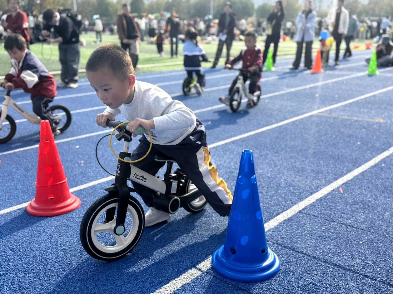 幼儿个人赛环节精彩纷呈。中班拍球比赛现场,计数声与加油声交织;平衡车竞赛中,“小橙子”们灵活穿梭障碍,稳稳操控车辆,展现出十足的胆量与协调性。大班赛场竞争尤为激烈,50米冲刺环节,小选手们全力奔跑、专注争先;扔沙包项目里,孩子们瞄准目标精准投掷。每一位“小橙子”都在赛场上奋力拼搏,展现出良好的精神风貌。