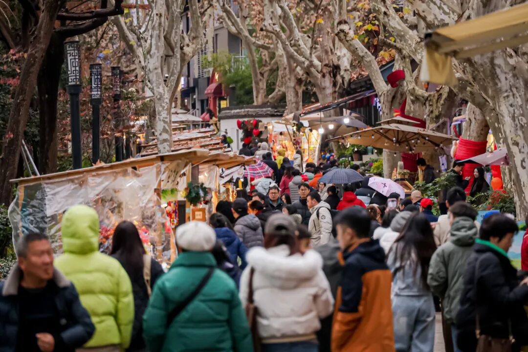 紧邻香积寺的是大兜路历史文化街区,这里的年味既有祈福时的庄重,也有市集里的热闹,是传统与生活并存的模样。市集上,年货、手作、非遗小物琳琅满目;沿河的咖啡店、茶馆里,人们围坐而谈,在一壶热茶、一杯咖啡中,把对新一年的期盼慢慢聊开。