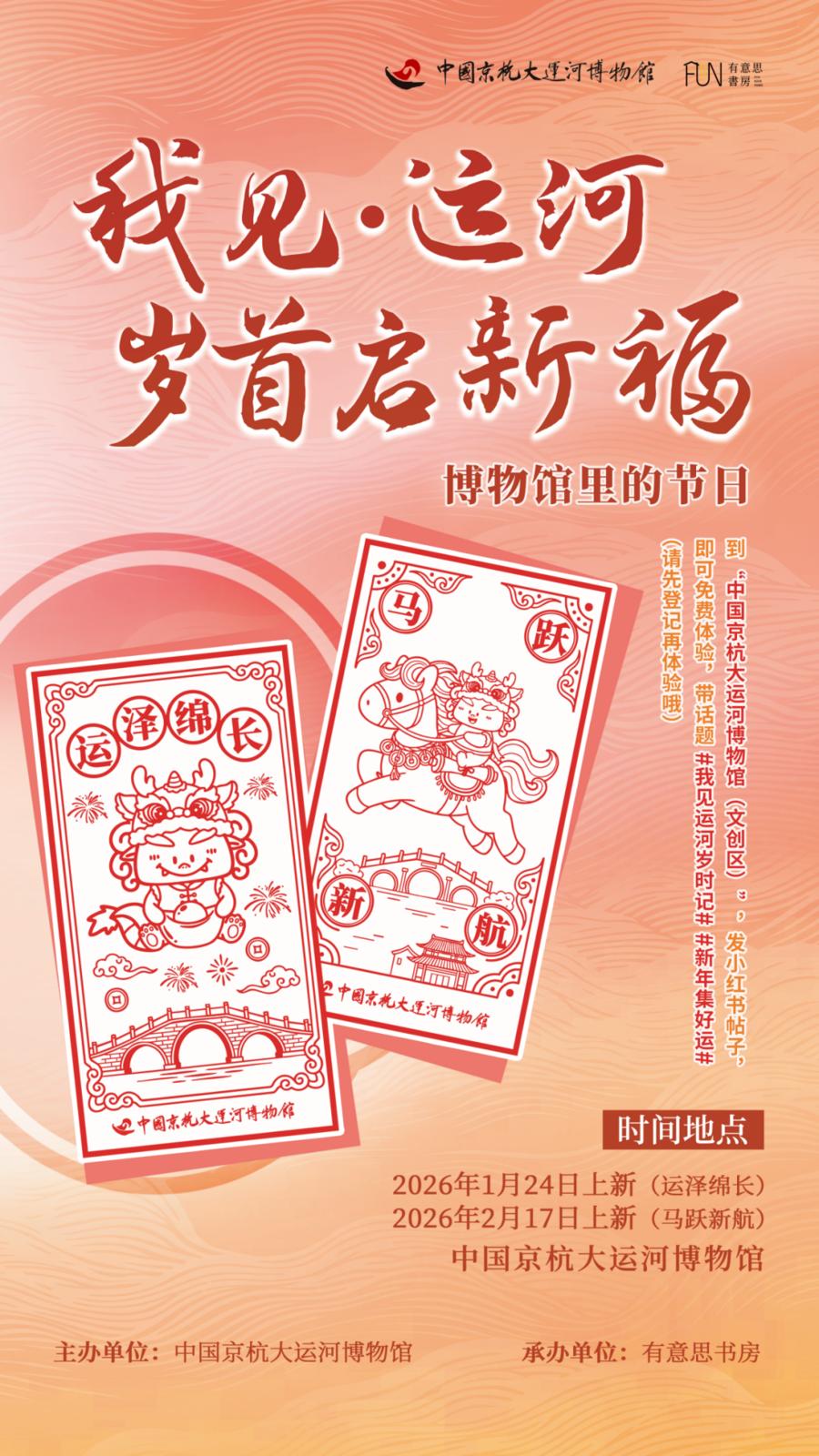 “我见·运河 岁首启新福”新年活动。邀请大家一起来体验“滚轮”新春桃符,定制带有“运泽绵长”“马跃新航”祝福语的滚印,打造虫八专属运河新春礼。
