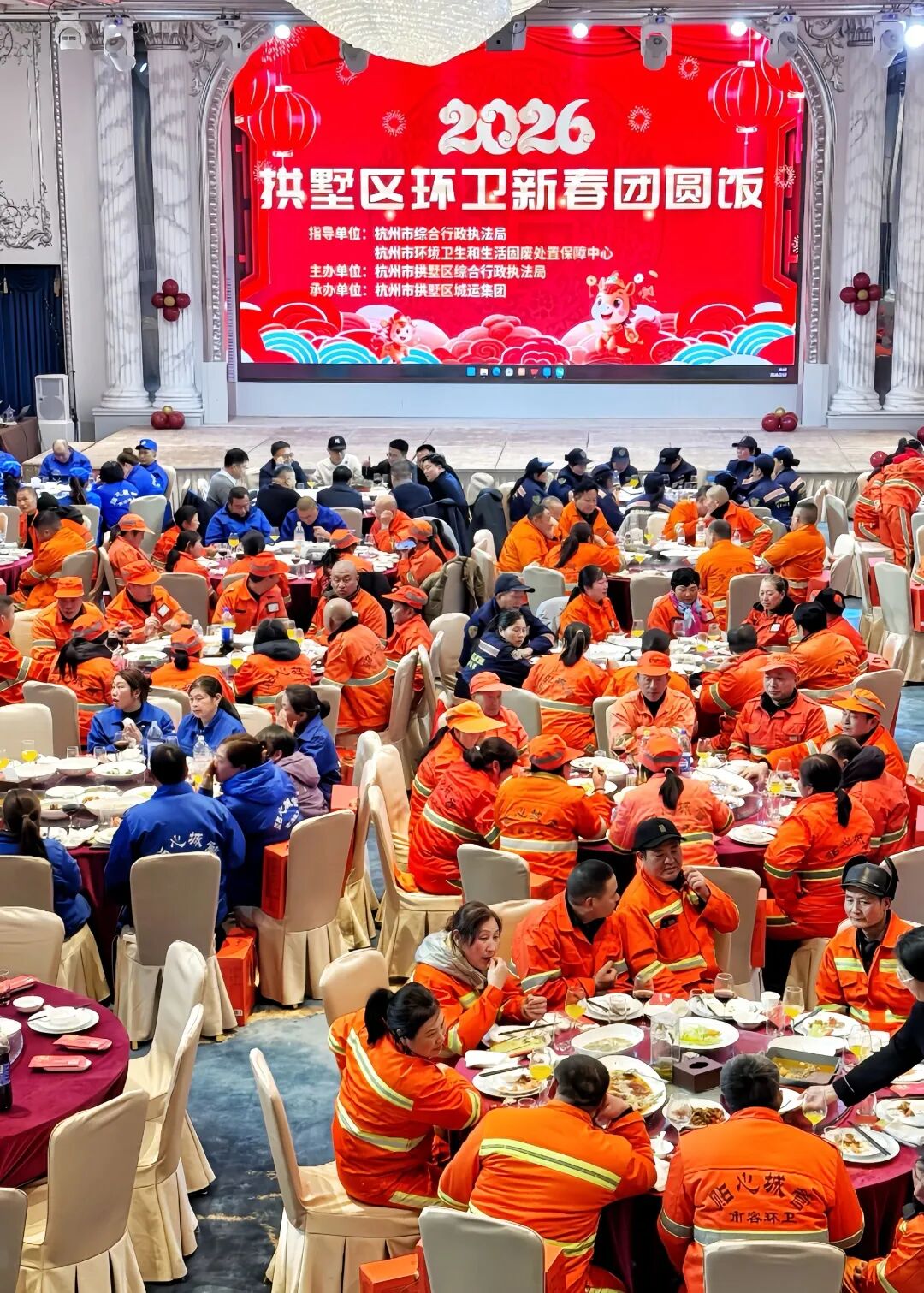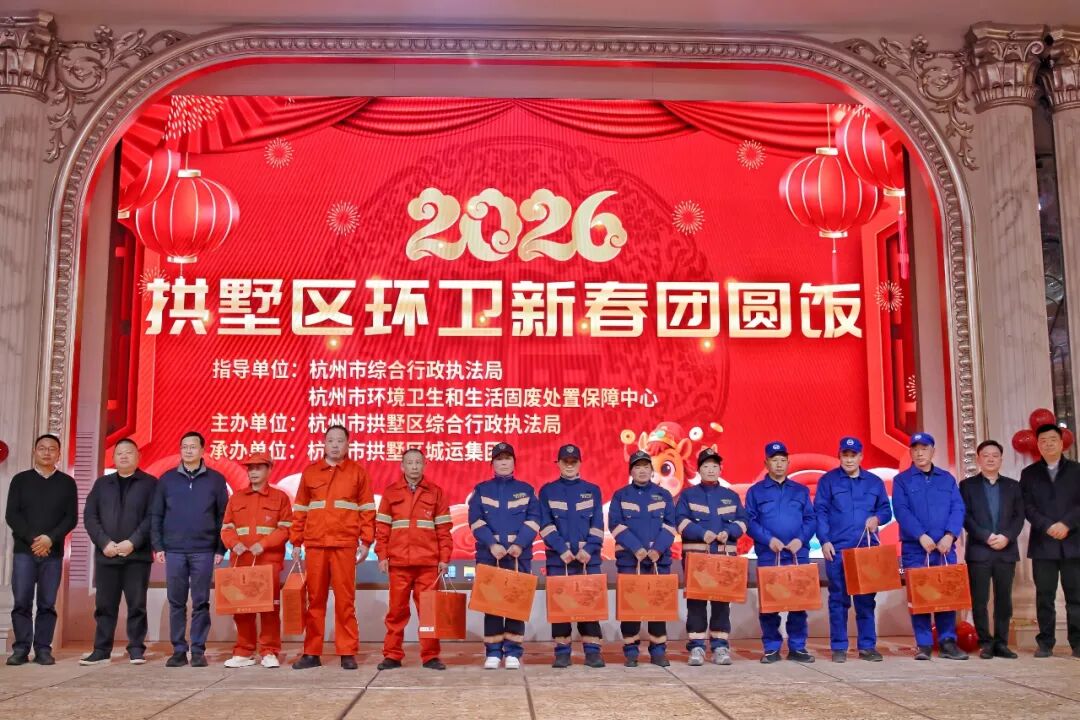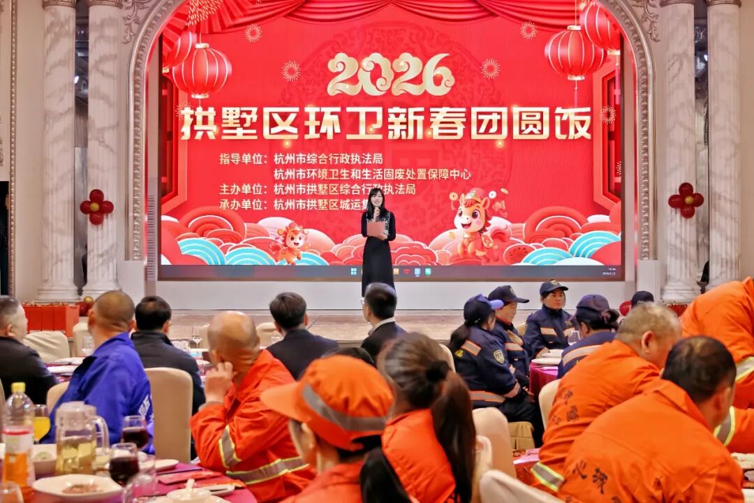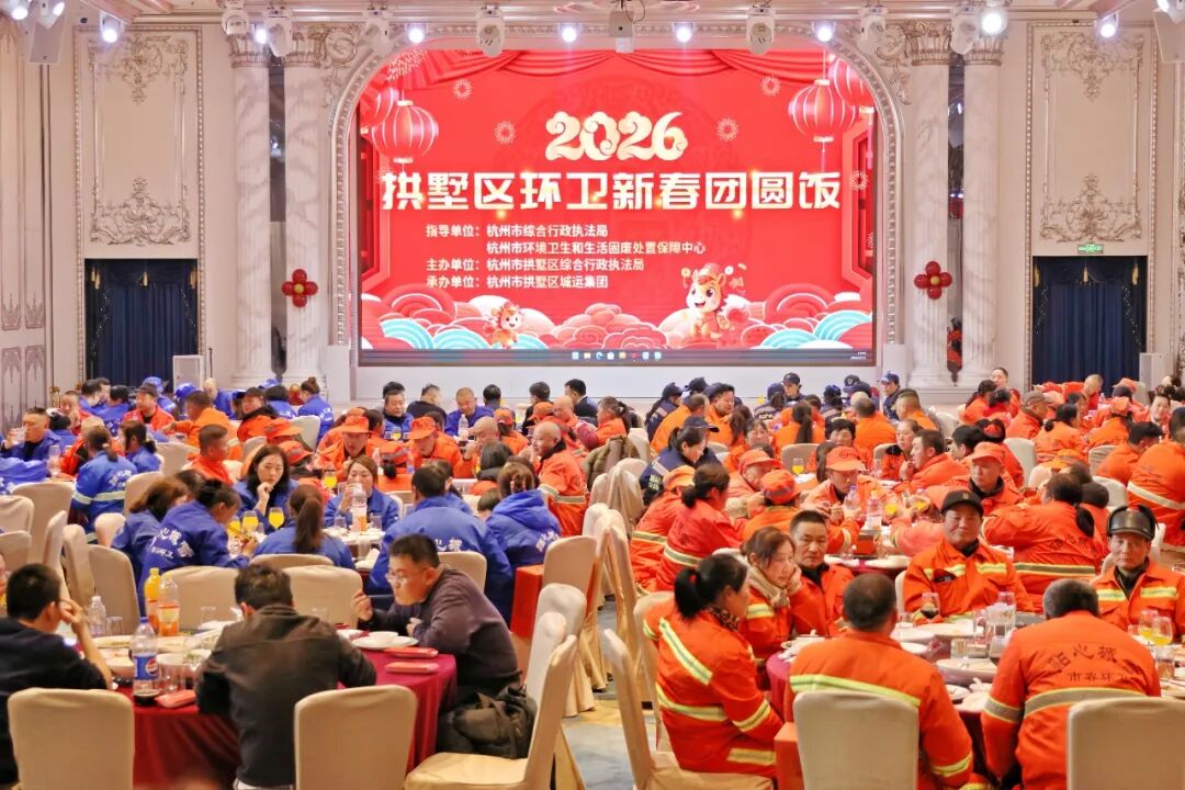 2月11日晚,在杭州市综合行政执法局、杭州市环境卫生和生活固废处置保障中心指导下,由拱墅区综合行政执法局主办、拱墅区城运集团承办的2026年拱墅区环卫新春团圆饭温馨开启。腊月廿四,正值南方小年,一场专门为“城市美容师”准备的年夜饭,让他们在小年之夜放下清洁工具,卸下一身疲惫,围坐圆桌,共迎新春。
