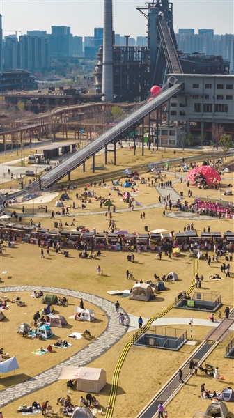 杭城气温持续回暖,刚刚过去的这个双休日,阳光在线、气温适宜。大运河杭钢公园的大草坪,成为不少市民游客露营、晒太阳的好去处。据市气象台消息,今天杭州主城区最高气温可达15-17℃,而未来的一段时间,气温在短暂的回升之后将持续下降,降温时间长,幅度也比较大。图为昨天人们在大运河杭钢公园露营,享受美好时光。