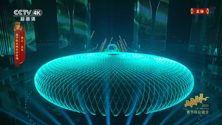 数贸港在春晚镜头下灵动变幻、层次丰富,流畅的建筑线条与柔美的光色交融,既烘托出浓郁的新春年味,又彰显出义乌从传统贸易向数字贸易跃升的蓬勃气象,成为义乌分会场的“最美C位”。