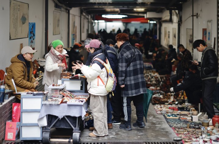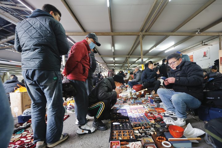 “周六最热闹的时候,人多得要‘横着走’!”一位老摊主笑着说。来自全国各地收藏爱好者蜂拥而至,摩肩接踵,交投两旺。举着手电筒端详玉器的,蹲在摊位前翻找旧书的,还有边喝茶边与摊主闲聊的……来买“古董”的大多是中年人,看到好东西需要跟摊主讨价还价。