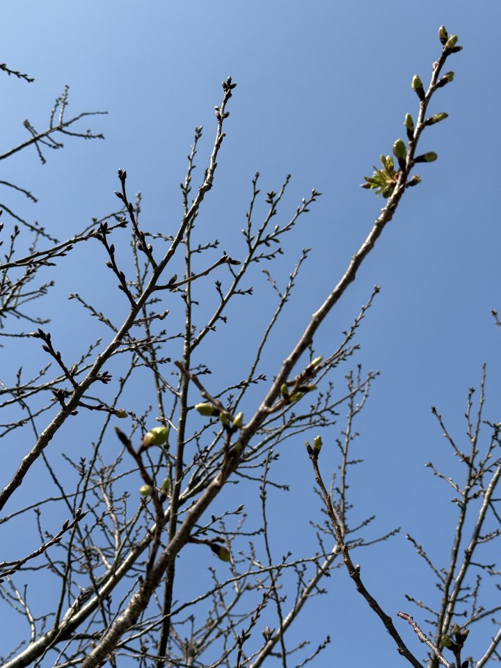 凑近细看才发现,枝头早已悄悄酝酿着春意。深褐色的枝条上,密密麻麻缀满了米粒大小的芽苞,它们紧紧挨着枝干,默默积蓄着能量。其中几颗性急的芽苞已经率先泛出嫩绿,像是给春讯按下了启动键,正等着温度和光照达标,就会奋力撑开芽鳞,让里面粉嫩的花瓣舒展身姿。