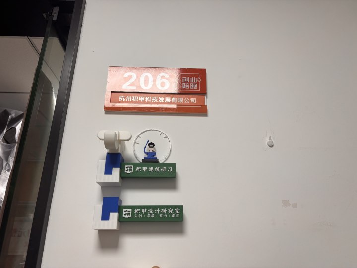 门口的公司招牌“杭州积甲科技发展有限公司”下方,挂着几个3D打印的积木,在普通的门牌上更添创意。