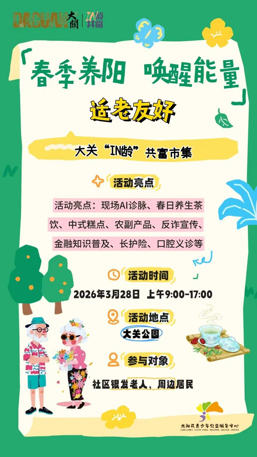 春回大地,万物复苏。在这个最适合“养阳”的季节,大关“IN龄”共富市集如约而至!本期市集以“春日养生集——唤醒能量篇”为主题,将于3月28日(本周六)09:00-17:00在大关公园温暖开市。这也是开年以来的第一期市集,欢迎居民朋友们届时来逛公园、学养生、品春味,一起唤醒春日能量!