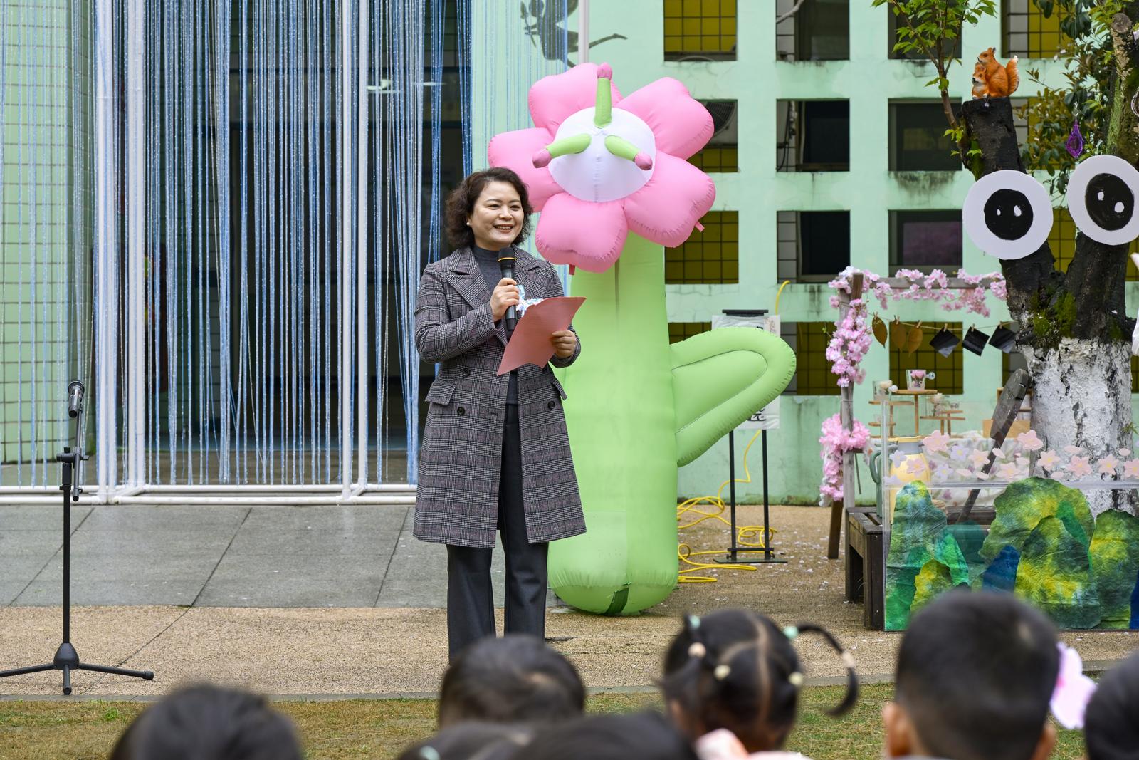 当十二位身着花裳的“小花仙”翩然而至,整个樱花节仿佛瞬间被点亮。他们是春天派来的小小信使,每一朵都代表着一种花的灵韵与美好。“我是玉兰小花仙,一到春天我就开满的白白的玉兰花,像一朵朵小云朵挂在树上。”“我是绣球小花仙,愿小朋友们像绣球花一样团结可爱,阳光自信!”……小花仙们用稚嫩而清亮的声音介绍着自己,与大家亲切互动,把花的祝福传递给在场的每一个人。