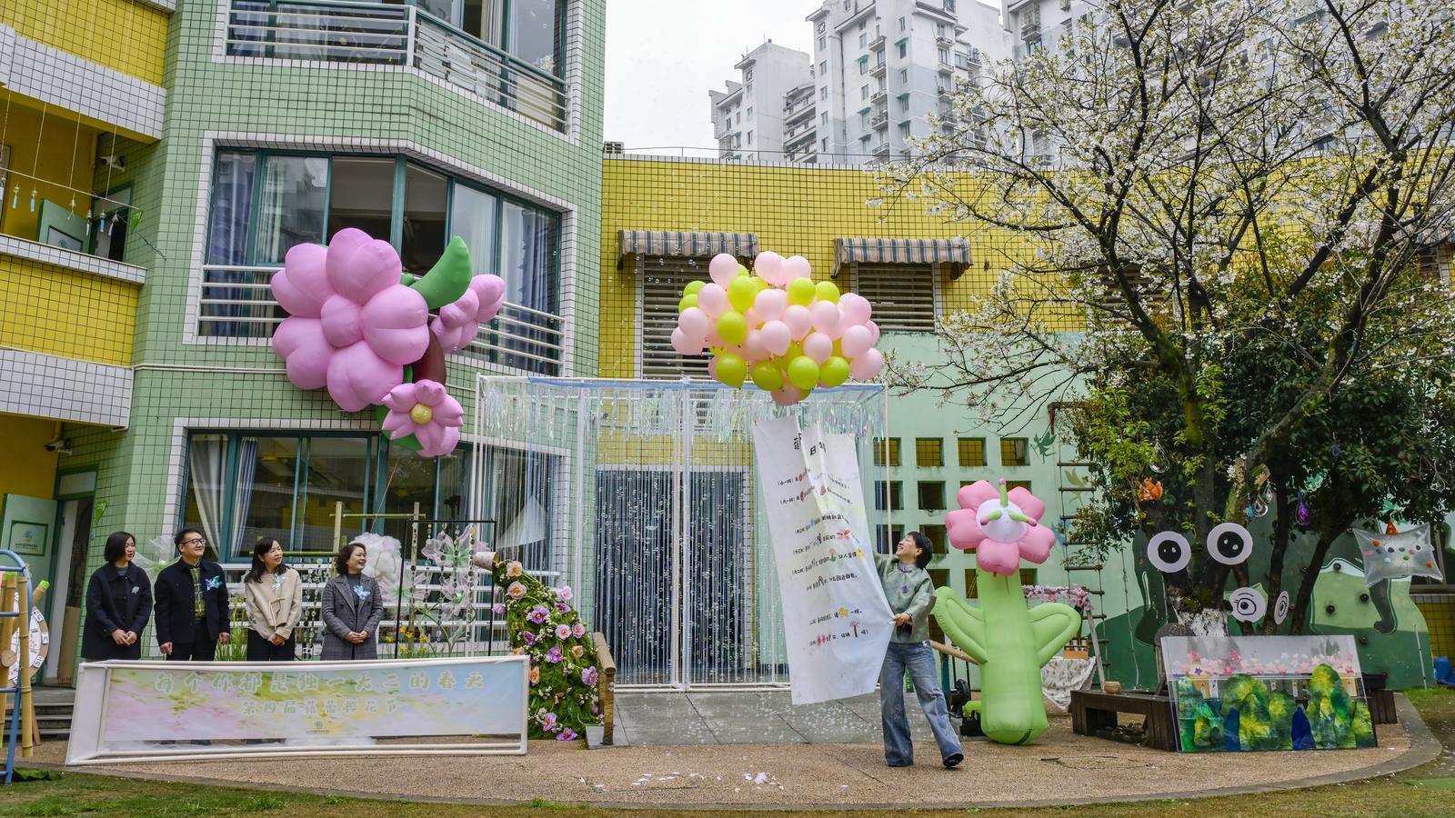 本次樱花节的欢喜与精彩,不止幼儿园,还随着孩子们的脚步一路欢声笑语,来到了附近的小河直街。他们与行人挥手问好,用前书写的方式画出古诗中的意象,邀请大家玩猜谜游戏,还热情地招呼着:“来幼儿园体验‘春色集市’里的自然游戏吧!”这是一封行走的“春日来信”——小花仙们用脚步丈量春天,用笑容传递生机。他们走出园门,走进街巷,与社区里的人、事、物建立联结,让社区成为可触摸、可互动的温暖家园。这封信里,写满了新生的希望、蓬勃的朝气,以及一年四季从春天开始的温暖寓意。