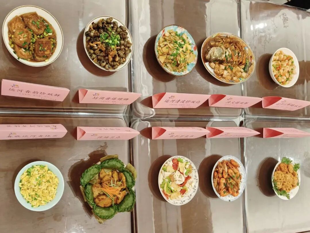 活动当日一早,新华坊大运河社区食堂便被精心布置一新。经过社区前期征集与层层选拔,运河清波炒双白、春晓运河香椿蛋、翠影墨鱼卷等10道饱含春天气息的家常菜,错落陈列在展示台上。每道菜品旁均立有介绍牌,清晰标注菜品做法,娓娓道来背后的运河故事。社区居民孙阿姨主动化身志愿者,协助工作人员摆放菜品、整理介绍牌,她感慨道:“这些家常菜,都是小时候记忆里地道的‘杭州味道’,而且用的都是春季时令食材,鲜得很!”