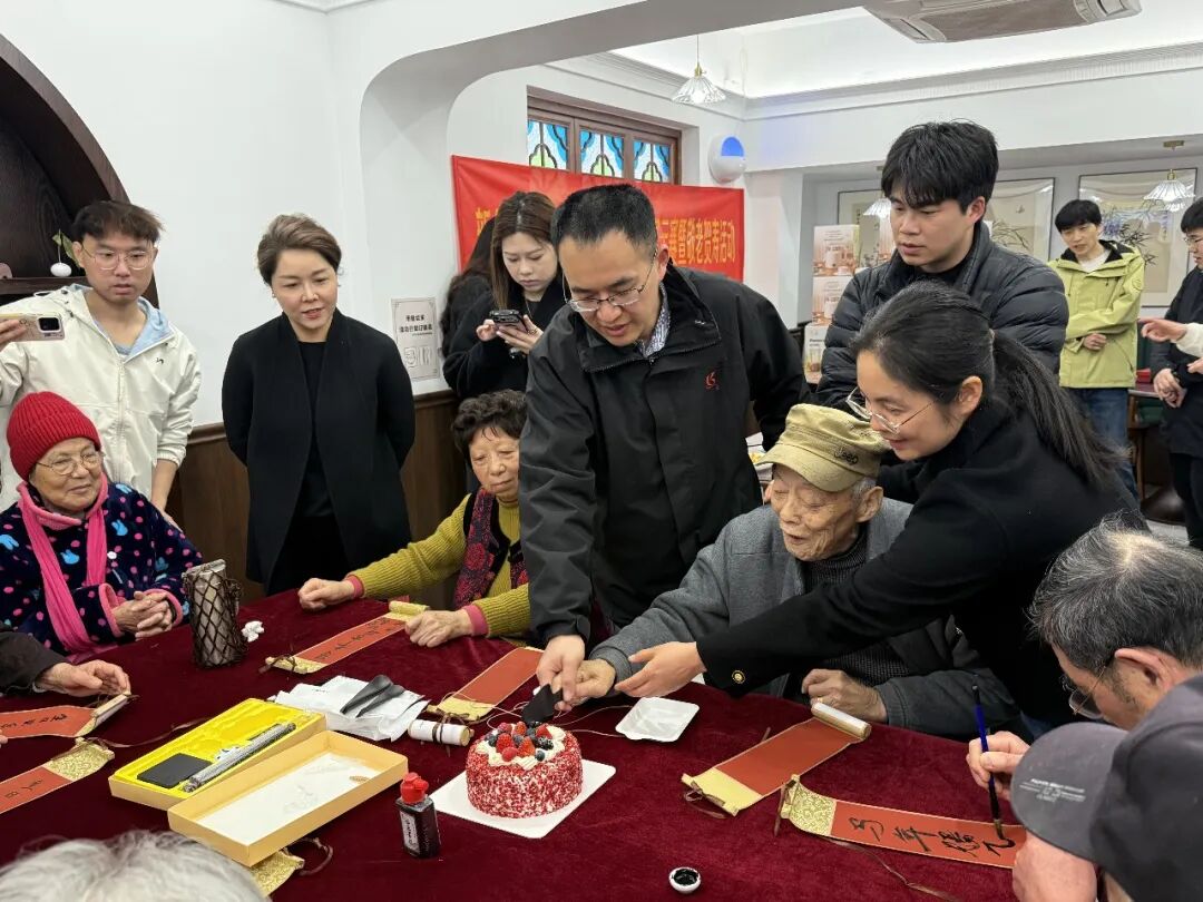 本次活动中,敬老贺寿仪式则是最温馨的环节。食堂内专门设立老人品尝区,志愿者们细心为老人夹菜、倒水,耐心询问老人们的口味偏好,细致周到的服务让老人们倍感暖心。社区党建联建单位泰隆银行贴心准备了低糖松软的生日蛋糕和毛笔纪念卷轴,为3月过生日的80岁以上老人举办了一场别开生面的集体生日会。新的社会阶层人士、社区志愿者与老人们一同在卷轴上书写祝福,有的老人颤巍巍地写下“平安”二字,有的则请身旁志愿者帮忙,写下对家人的美好寄语。