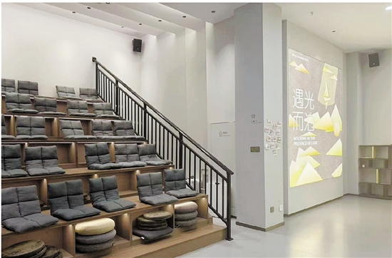 萧山区地铁2号线建设一路站往东走400米,万流新邸小区的沿街商铺中,“泊光集”三个字十分醒目。这是一处集咖啡吧、书房、文艺剧场、讲座课程、展演活动于一体的600平方米社区空间。内部的房间被设计成了适用于各种场景的活动空间“盒子”,比如适合学习的自习盒子、不定期更新超前艺术展览的空盒子、用于心理咨询的咨询盒子……最大的一处“灰盒子”,设计了台阶座位区,用来举办戏剧活动、电影放映、讲座课程等。