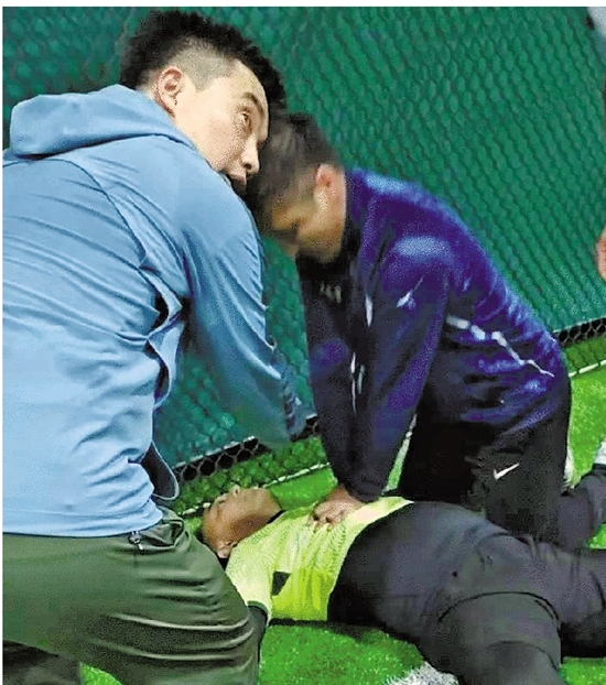 黄文者和陈光晖是最先参与救援的,他们一边呼唤着倒下的球友,一边小心地将其身体摆正到适合心脏复苏的姿态。