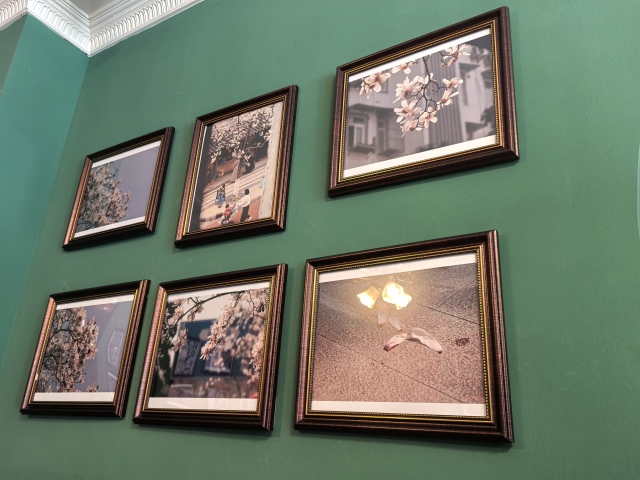 墨绿和深棕撞色的墙面上,挂着15幅精心装裱、以玉兰花为主题的照片,既有专业相机的精巧构图,也有手机随手捕捉的鲜活瞬间。在运河边响起的粤语老歌中,时间仿佛慢了下来,优雅的洁白从树枝凋落,又在悠扬中长久绽放……