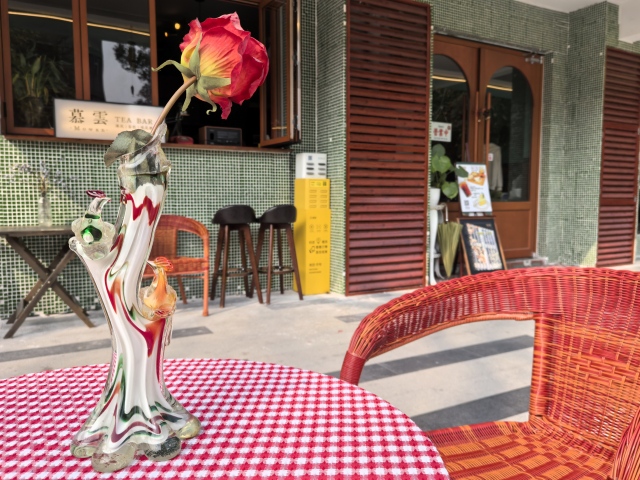 天气晴好的周末,慕云在店门口的空地展开折叠桌,铺上红白相间的桌布,小心摆上融入红、绿、橙彩色流纹的树干状玻璃花瓶。花瓶上,两只扭头对视的小鸟充满生命力,略微泛黄的底座充满年代感,完美契合复古港风的茶室风格。